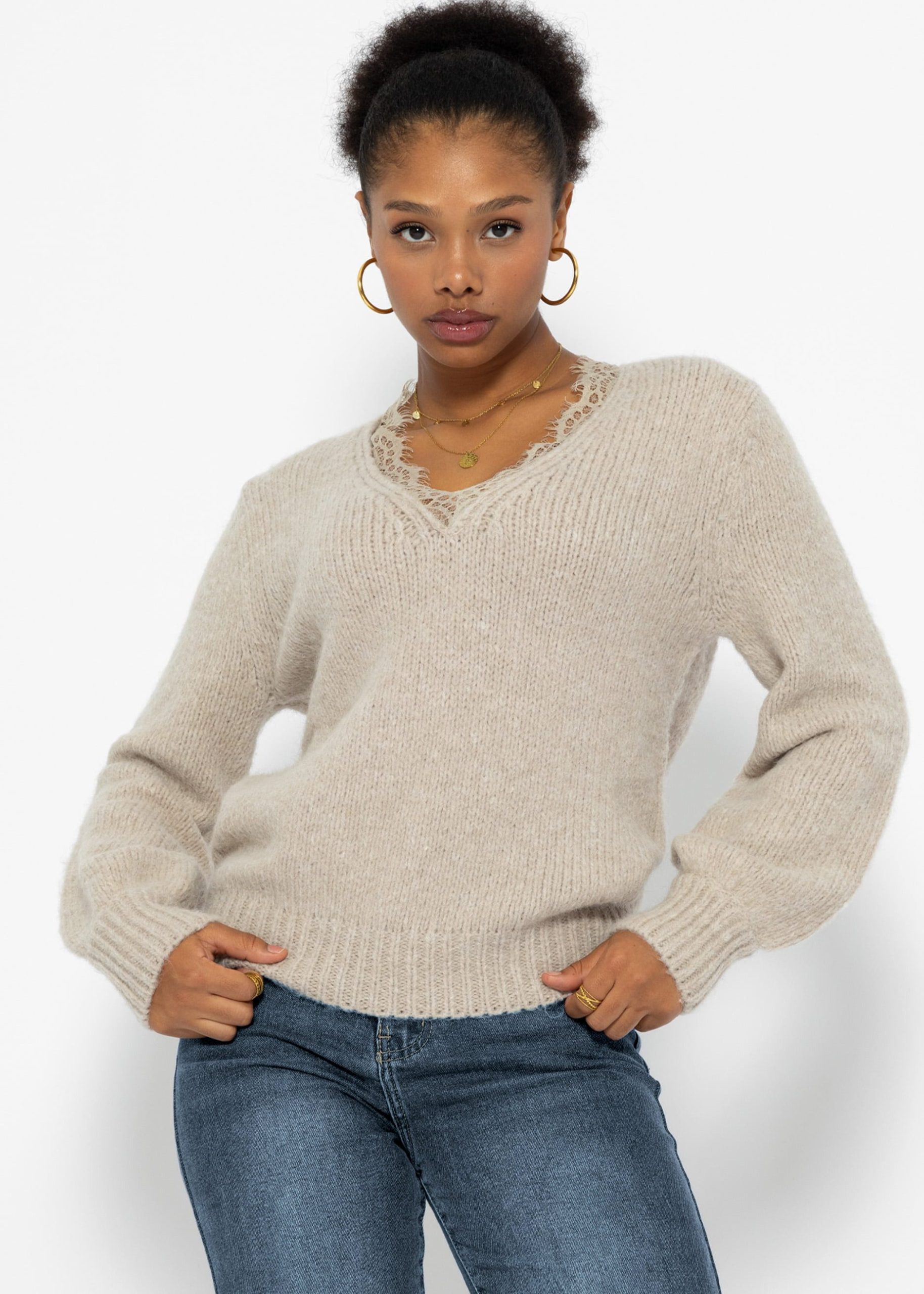 SASSYCLASSY Strickpullover Damen Pullover Elegant mit Spitzen V Ausschnitt Lässiger Strickpullover mit Spitzendetail am Kragen Beige Schwarz Weiß